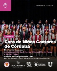 El Viernes 26 de Septiembre de 2025 se presentará Concierto Coro de Niños Cantores de Córdoba, con la participación del Coro de Niños del Fin del Mundo y del artista Damián Torres.