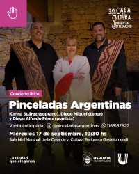 El Miércoles 17 de Septiembre de 2025 se realizará el Concierto lírico Pinceladas Argentinas, a cargo de la soprano Karina Suárez, el tenor Diego Miguel y el pianista Diego Alfredo Pérez.