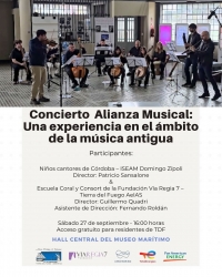 El Sábado 27 de Septiembre de 2025 se llevará a cabo el Concierto Alianza Musical en Ushuaia. Participarán del mismo Niños Cantores de Córdoba, ISEAM Domingo Zípoli (Dir. Patricio Sansalone) y Escuela Coral y Consort de la Fundación Vía Regia 7 , Tierra del Fuego AeIAS (Dir. Guillermo Quadri | Asist. Fernando Roldán)