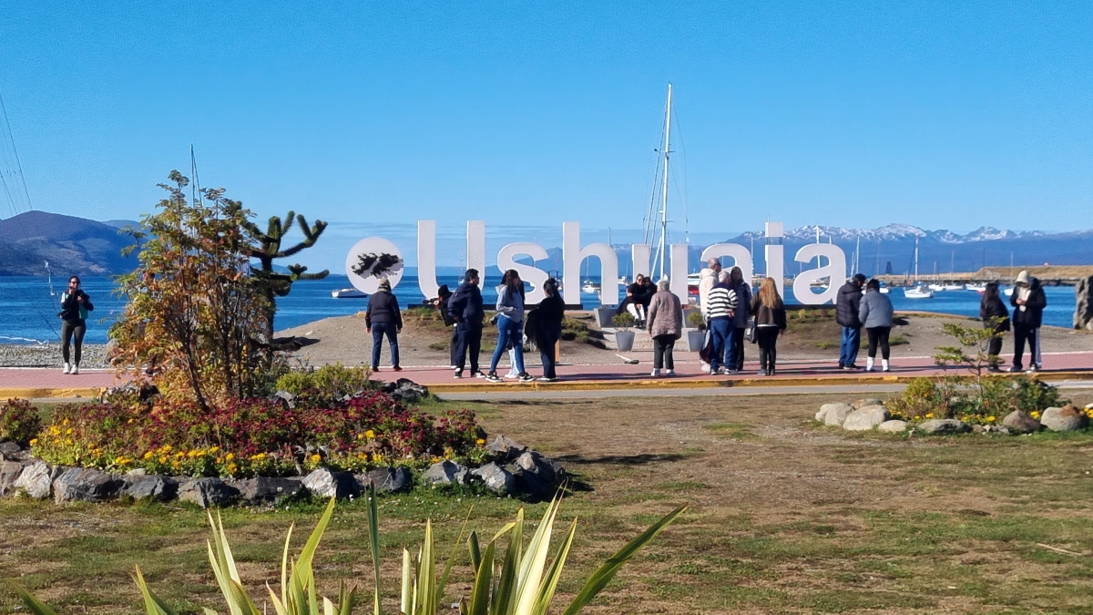 05/04/2026 | 13:44 hs, el cartel de Ushuaia frente a la bahía